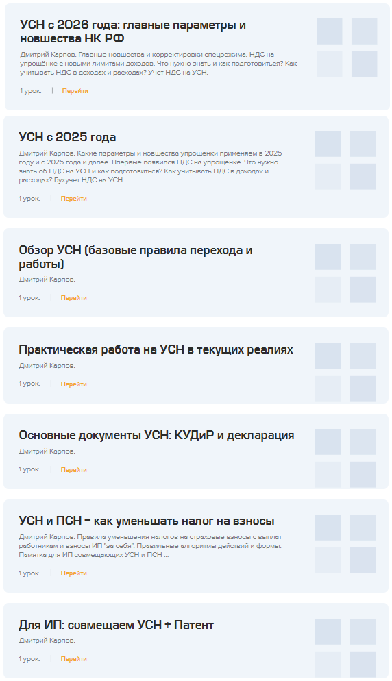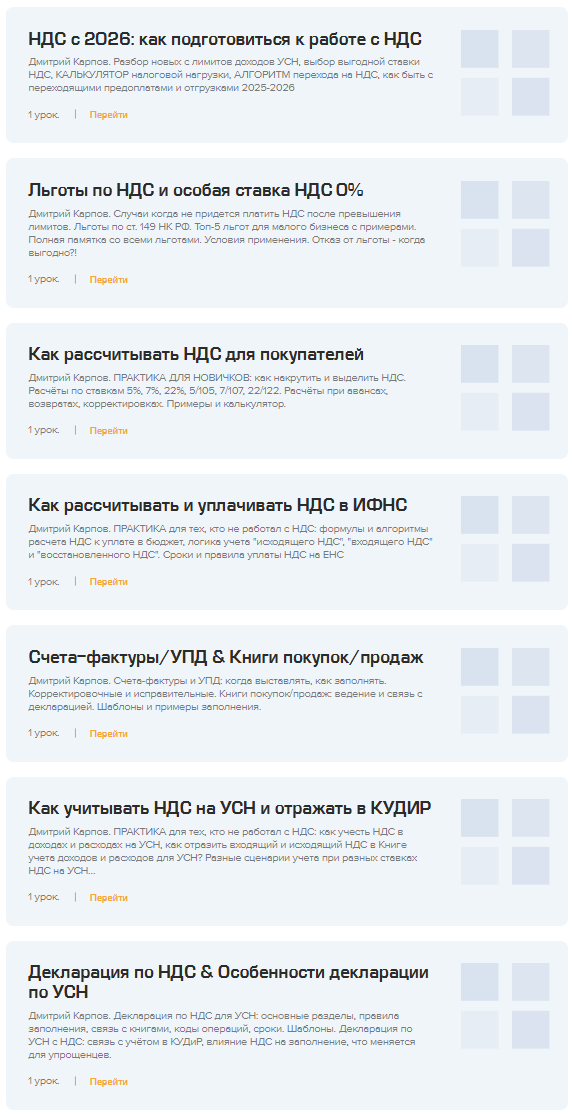 1) Базовые уроки по урощёнке с НДС и без плюс дополнительный практический экспресс-курс «АвтоУСН» с 2026 года.