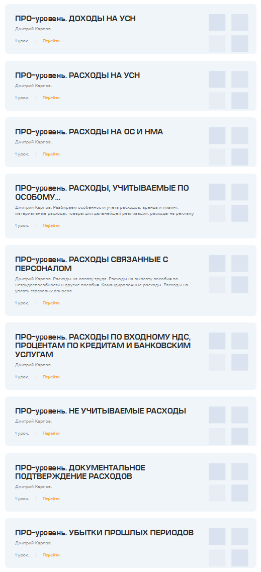 2) Семь дополнительных уроков по самым сложным вопросам УСН: правильный учёт доходов и расходов, особенности работы с ОС и НМА, расходы с ограничениями и лимитами, расходы на персонал и аренду с НДС, документальное подтверждение расходов и учёт прочих периодов. Эти уроки помогут избавиться от страхов «как правильно учесть все расходы, чтобы не переплатить» и «как документально подтвердить каждый рубль».